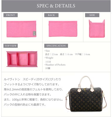 SPEC & DETAILS FRONT BACK SIDE TOP VIEW SPECIFICATION ・ Size長さ:23cm 高さ:14cm マチ幅:14cm ・ Weight160g ・ Number of Pockets10個 ルイヴィトン スピーディ25サイズにぴったりフィットするようにサイズ取りしております。