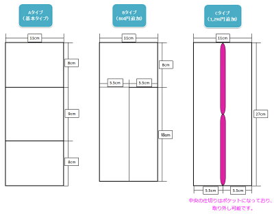 Aタイプ ポケット数10個 Bタイプ ポケット数11個 Cタイプ ポケット数11個 NEW!! Dタイプは、 Aタイプをベースに 長財布を入れられる 横長のボックスを追加 しました! Dタイプ ポケット数11個 バッグの中身はお客様によって当然異なります。